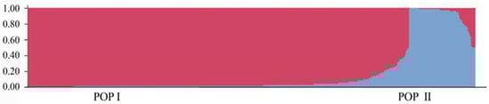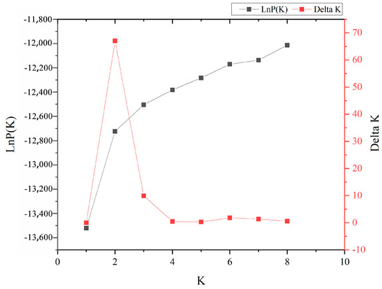 To further investigate the population genetic structure and relationships among the 417 P. elliottii samples, STRUCTURE software was used to analyze the data based on 19 pairs of SSR primers. The results (Figure 2) showed that as the K value increased, the lnP(D) also increased continuously. The most significant change in the lnP(D) occurred when the K value increased from 1 to 2, with the ∆K reaching its maximum peak at K = 2, indicating that the 417 P. elliottii samples were divided into two distinct subgroups (Figure 3).