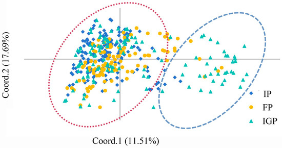 The genetic similarity coefficients and genetic distances among the three provenances were calculated using Nei’s method (Table 9). The genetic distance between the IP and the FP was 0.014, with a genetic similarity coefficient of 0.986. The genetic distance between the IP and the IGP was 0.020, with a genetic similarity coefficient of 0.980. The genetic distance between the FP and the IGP was 0.019, with a genetic similarity coefficient of 0.981. These results indicate that the IP is more closely related to the FP than to the IGP.