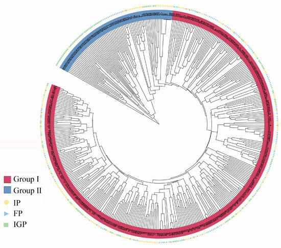 A clustering dendrogram of the 417 P. elliottii germplasm samples was constructed using the unweighted pair group method with arithmetic mean (UPGMA) in MEGA software. As indicated by the clustering results (Figure 5), the P. elliottii germplasm did not cluster strictly according to the IP, FP, and IGP. Instead, the samples were broadly divided into two groups. Except for a small number of samples with discrepancies, the clustering results were largely consistent with the findings from the PCoA and STRUCTURE analyses.