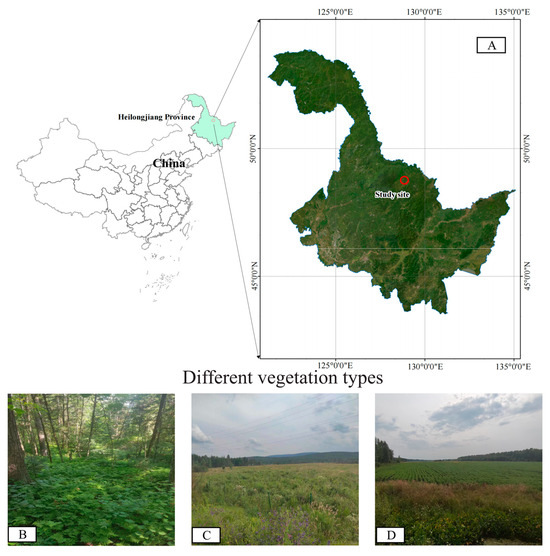 The study area is located in the Hongxing National Nature Reserve (Figure 1), within the Lesser Khingan Mountains, situated in the northeast of Heilongjiang Province, China (128°21′40″~128°53′30″ E and 48°41′20″~49°11′00″ N). Covering an area of 111,995.3 hectares, the reserve experiences a northern temperate continental monsoon climate, characterized by an annual average temperature of −0.7 °C, an average precipitation range of 500–610 mm, and an average relative humidity of 71.1%. The Hongxing National Nature Reserve is notable for its high biodiversity, encompassing a range of ecosystems including typical swamp, meadow wetland, shrub, and forest vegetation. The reserve is home to 1929 species, among which 885 are plant species and 197 are bryophytes distributed across 49 families. Additionally, the reserve contains 38 species of ferns from 11 families and 650 species of seed plants from 88 families [24]. The soils within the World Reference Base for Soil Resources (WRB) of Sucre are classified as Alfisols, Mollisols, and Vertisols [25]. The wetland park within the reserve is categorized into seven types of wetland: rivers, flood plains, herbs, mosses, swamp meadows, shrub swamps, and forest swamps. The primary landscape of the park is dominated by herb and swamp meadow wetlands, which are surrounded by agricultural lands.