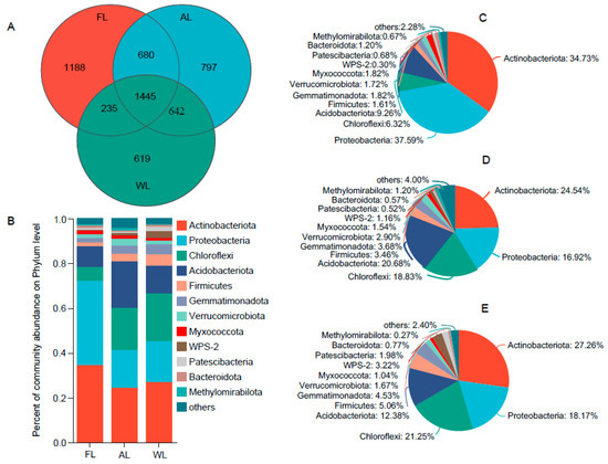 Relative abundance of soil bacterial communities under different land uses at the phylum level. Abbreviations, FL, forestland; AL, arable land; WL, wetland. (A) Venn diagram of soil microorganisms based on the level of OTUs. (B) Relative abundance of soil bacterial communities under different land uses at the phylum level. (C) Community analysis pieplot on phylum level in FL. (D) Community analysis pieplot on phylum level in AL. (E) Community analysis pieplot on phylum level in WL.
