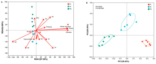 Redundancy analysis (RDA) of the bacterial data revealed that soil physicochemical properties explained the majority of the variance in the RDA results as the first two axes explained 87.59% (Figure 3A). The wetland bacterial communities were positively correlated with SOC, while the AL was positively correlated with AP, AK, AN and β-glucosidase. The FL was positively correlated with soil pH, TK, TP, nitrate reductase, urease, and cellulase. In the analysis of beta diversity, WL was separated from the other two land use types, suggesting a clear distinction in the bacterial community structures between wetlands and forests and arable land (Figure 3B). In general, the PCoA explained 58.7% of the variation in the bacterial communities.