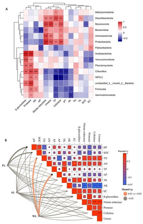 The heatmap of the correlation between soil environmental factors, soil enzymes, and soil microbial community composition (Figure 4A) indicates varying degrees of correlation between these factors at the phylum level. Specifically, AN shows a significant positive correlation with Chloroflexi, WPS-2, and Firmicutes and a significant negative correlation with Bacteroidota. AP is significantly negatively correlated with Bacteroidota and Patescibacteria. TP exhibits a significant positive correlation with Desulfobacterota, Proteobacteria, Methylomirabilota, and Myxococcota and a significant negative correlation with WPS-2, Patescibacteria, Chloroflexi, Firmicutes, and Gemmatimonadota. Soil pH is significantly negatively correlated with Chloroflexi, WPS-2, Acidobacteriota, and Firmicutes. AK is significantly negatively correlated with Firmicutes and Gemmatimonadota. TK shows a significant positive correlation with Desulfobacterota (p < 0.05). SOC is significantly negatively correlated with Myxococcota (p < 0.05). EC is significantly positively correlated with Patescibacteria (p < 0.05) and significantly negatively correlated with Verrucomicrobiota (p < 0.05). β-glucosidase is highly significantly positively correlated with Acidobacteriota and Verrucomicrobiota (p < 0.001). Protease is highly significantly positively correlated with Acidobacteriota, Chloroflexi, and unclassified_k_norank_d_Bacteria (p < 0.001). Nitrate reductase is highly significantly positively correlated with Myxococcota, Actinobacteriota, and Proteobacteria (p < 0.001) and significantly negatively correlated with Chloroflexi (p < 0.05). Urease is significantly positively correlated with Myxococcota, Proteobacteria, Desulfobacterota, and Actinobacteriota. Cellulase is highly significantly positively correlated with Proteobacteria and Myxococcota and significantly negatively correlated with WPS-2 and Chloroflexi. As shown in Figure 4B, WL exhibits a strong positive correlation with soil properties such as SOC, TN, and AN, as well as with enzyme activities like protease and cellulase. Additionally, AL and FL show a significant correlation between EC and AK.