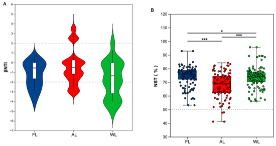 βNTI values (A) and normalized stochasticity ratio (NST, (B)) of the soil bacterial community under different land use patterns (* p< 0.05, *** p< 0.001). Abbreviations, FL, forestland; AL, arable land; WL, wetland.