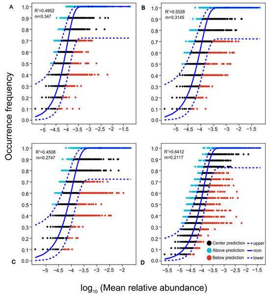 Neutral community models under different ecosystems. (A): Forestland (FL). (B): Arable land (AL). (C): Wetland (WL). (D): Overall level. The solid line indicates the fitting of the neutral model, while the upper and lower dotted lines represent the 95% confidence level of the model prediction. Blue represents OTUs above the confidence interval, black represents OTUs within the confidence interval, and red represents OTUs below the confidence interval.