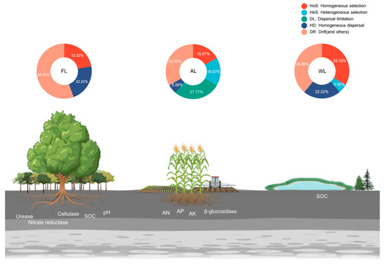 Concept figure of the assembly of soil microbial community under different land use types. Abbreviations, FL, forestland; AL, arable land; WL, wetland; SOC, soil organic carbon; AN, available nitrogen; AP, available phosphorus; AK, available potassium.