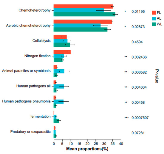 The FAPROTAX algorithm selected the top nine functional groups in the soil bacterial community according to their sequence ranking and statistically analyzed the functional bacterial abundance. As shown in Figure 8, land use patterns can change the abundance of soil functional microorganisms. The relative abundance of chemoheterotrophic bacteria was highest in WL (36.65%), followed closely by FL (35.01%) and AL (29.81%), with the abundance in FL and AL being 18.65% and 4.47% lower than that in WL, respectively (p < 0.05). The relative abundance of aerobic chemoheterotrophic bacteria was recorded at 34.73% in FL and 31.96% in WL. Furthermore, the relative abundance of nitrogen fixation bacteria was notably higher in AL (10.02%), which represented increases of 39.59% and 47.63% compared to WL and FW, respectively (p < 0.01). Similarly, the levels of animal parasites or symbionts, all human pathogens, and human pneumonia pathogens were found to be higher in AL than in FL and WL (p < 0.01).