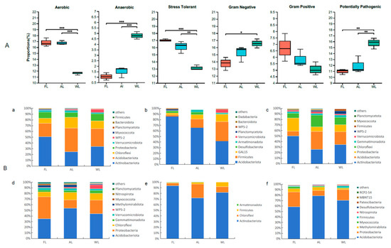 BugBase phenotype prediction of soil bacterial communities in different land use patterns. * p < 0.05; ** p < 0.01; and *** p < 0.001. (A) Using Bugbase in different land use patterns. (B) Species and phenotype contribution analysis. (a) Aerobic. (b) Anaerobic. (c) Stress tolerant. (d) Gram negative. (e) Gram positive. (f) Potentially pathogenic. Abbreviations, FL, forestland; AL, arable land; WL, wetland.