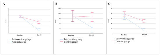 | Variable | Controls Mean Difference Changes (95% CI) | Controls Mean Difference Change in Percentage (%) | Intervention Group Mean Difference Changes (95% CI) | Intervention Group Mean Difference Change in Percentage (%) | Between Groups Mean Difference Changes (Supplemented Minus Control Effect) (95% CI) | Between Groups Mean Difference % (Supplemented Minus Control Effect) | p-Value Between Groups |