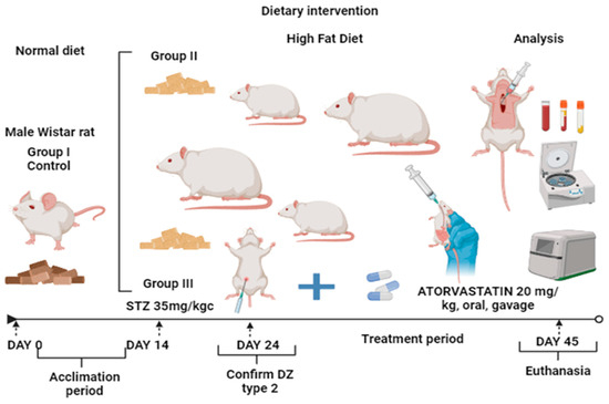 Experimental design. In this experimental study, we included twenty-one Wistar rats. After 14 days of acclimatization, the rats were allocated into 3 groups: group I (control group reserved standard diet), group II (with obesity, the animals constantly received special food, with high-fat diet with cholesterol 2%), and group III (initially with obesity, and then diabetes mellitus, the animals constantly received special food, with high-fat diet with cholesterol 2%). In group III, after 14 days, we administered treatment with STZ to induce diabetes mellitus (35 mg/kg of body weight). We evaluated the levels of glycemia at 7 and 10 days following the injection and confirmed the diagnostics of T2DM at 10 days. After the confirmation, we administrated atorvastatin treatment in dosages of 20 mg/kg of body weight, orally, by gavages, every day for the next 20 days. In the final experiment, we sampled blood by cardiac puncture. The blood was stored in special vacutainer tubes with a clot activator solution for biochemical assays.