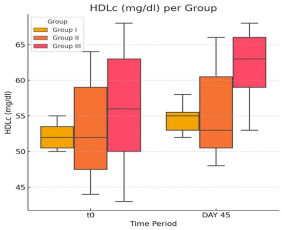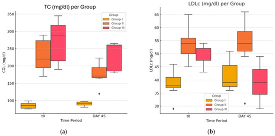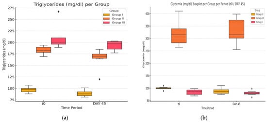 In our groups, in the case of TG levels (Figure 4a,b), we observed that there were statistically significant differences (p ≤ 0.05) when comparing the three groups (G-I to G-III) at each of the two time points.