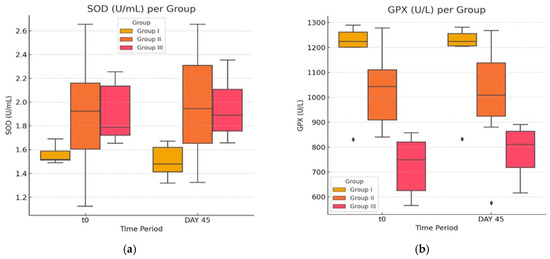 The data for each biochemical marker were visualized using box plots to represent the interquartile range (IQR) alongside median values. The biochemical parameters were plotted using Python version 3.11 according to the experimental groups (group I, group II, and group III) across two time points (T0 = day 24; and day 45). The box plots were generated using the Seaborn library, with the boxes indicating the 25th to 75th percentiles, the line within the box representing the median, and whiskers extending to 1.5 times the IQR. Outliers were visualized as individual points.
