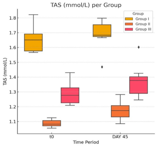 TAS is characterized by the capacity to neutralize free radical burden, serving as a measure of the productivity of cellular antioxidant systems. A decrease in TAS concentration indicates an increase in oxygen free radicals, with a decline in the capacity of the antioxidant defense mechanism. Additionally, TAS can reflect the antioxidant potential of drugs and determine if a new treatment has efficacy on the body’s antioxidant system [73].