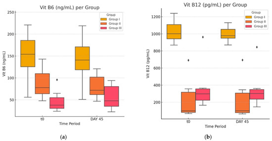 In the last part of our study, we evaluated the impact of atorvastatin on vitamin and Hcy levels. A comparison between the value of means in each of the experimental groups between the initial and final datasets (Figure 7a and Figure 8b) shows that statin treatment had no statistically significant effect on serum levels of vitamin B12, B6, and folic acid (p > 0.05).