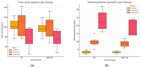 (a,b) Homocysteine and folic acid levels before and after the experimental study. The ♦ symbol denotes an outlier.
