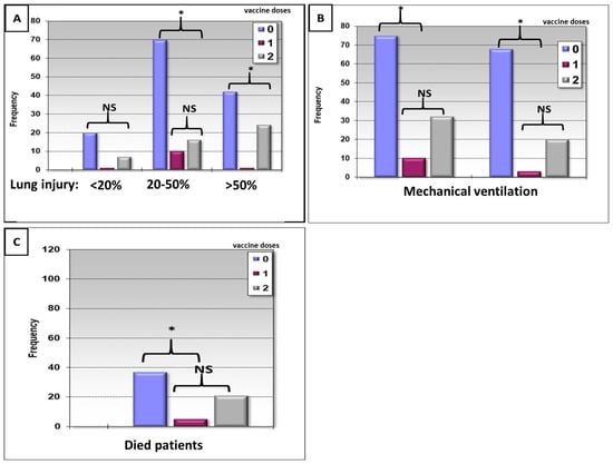 The early effect of the SARS-CoV-2 vaccine (non-vaccinated, one-dose vaccinated, and two-dose vaccinated) on the frequency of lung injury (A), frequency of mechanical ventilation usage (B), and frequency of mortality (C). The frequency of lung injury (A), mechanical ventilation (B), and mortality (C) is shown. 0 is non-vaccinated patients, 1 is one-dose SARS-CoV-2 vaccinated patients, and 2 is two-dose vaccinated patients. * p < 0.05. The statistical comparison was performed between non-vaccinated patients (0) and one-dose vaccinated patients and on the other hand between two doses of vaccination and 0 and 1 dose. Since the statistical behavior of one dose of the vaccine or no dose was similar, the statistical marking in the graph shows the two vaccine dose group versus the other two groups. NS: not significant.
