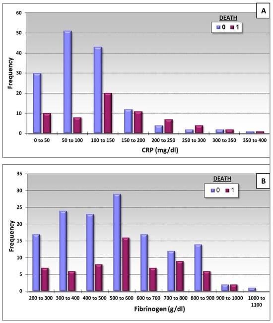 The early survival frequency of the patients who survived and died according to the levels of CRP (A) and fibrinogen (B). The blue columns are the survival patients (0) and the violet ones are the non-survivals (1).