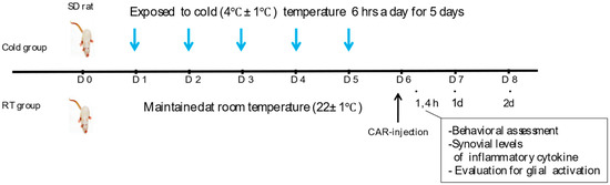 After a period of adaptation, rats were randomly assigned to an experimental (Cold group) or a control group (RT group). The Cold and RT groups were kept in identical conditions, with a 12-h light/dark cycle and relative humidity of 50 ± 5 percent. Ad libitum food and water were given, and the only distinction between the groups was the temperature (4 °C vs. 22 °C). For the cold exposure, the animals were housed in a noise-free cold chamber. The Cold group (n = 8) was exposed to the noxious cold temperature (4 ± 1 °C) 6 h a day for 5 days, respectively, with relative humidity (50 ± 5%); an RT group was kept consecutively without any thermal changes during the same period (n = 8). And then, on the sixth day, all rats were gas-anesthetized with 3% isoflurane (JW Pharmaceutical Corp, Seoul, Republic of Korea), and followed to inject into the right knee joint with 0.1 mL of 2% Carrageenan (Sigma, St. Louis, MO, USA) for the induction of acute knee arthritis (Figure 1). The cold exposure temperature (4 ± 1 °C) was selected based on previous studies investigating cold-induced inflammatory responses [25,26]. This temperature has been shown to effectively induce cold stress responses while maintaining ethical considerations for animal welfare.