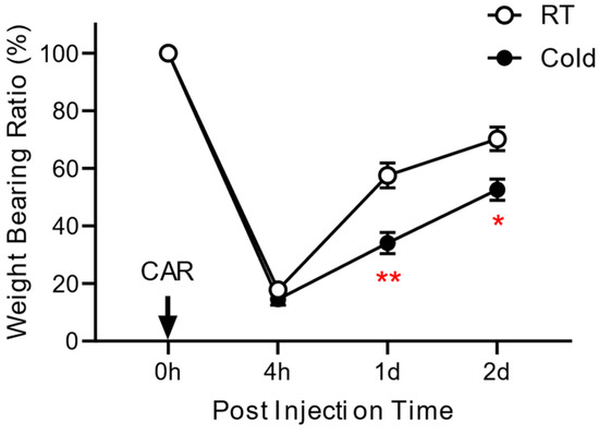 Effect of repeated exposure to ambient cold on the pain behavior. The weight-bearing ratio (WBR) of the affected hind limb in the Cold and RT groups was examined at 4 h, 1 d, and 2 d after carrageenan (CAR) injection. The WBR was calculated as the percentage of WBF of the post-injection value over the pre-injection value, and data are expressed as mean ± the S.E.M. * p < 0.05, ** p < 0.01, compared to the RT group.