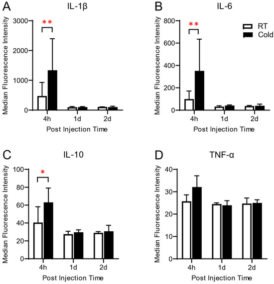 Next, to investigate whether cold exposure before acute inflammation induces any change in the local inflammatory response, we measured the synovial levels of pro-inflammatory (Interleukin (IL)-1β, IL-6 and tumor necrosis factor (TNF)-α, and anti-inflammatory (IL-10) cytokine. Synovial levels of IL-1β, IL-6, and IL-10 were significantly increased in the Cold group at 4 h post-arthritic induction (p < 0.001, p < 0.001, and p = 0.0038, respectively), compared to those of the RT group, and fell to the basal level of RT group after 1-day post-induction (Figure 3). There was a slight increase in TNF-α at 4 h but no statistical difference was observed.
