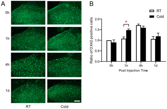 Effect of repeated exposure to ambient cold on the expression of OX-42 positive cells in spinal cord. (A) Representative images of OX-42 positive cells in spinal cord, (B) the ratio of number of OX-42 positive cells in Cold group, compared to RT group were analyzed at the time courses of 0 h, 1 h, 4 h and 1 d. Scale bar = 40 µm. * p < 0.05, vs. RT (Two-way ANOVA followed by Tukey’s method). Data are presented as mean ± S.E.M.