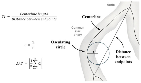 Centerlines were generated for the infrarenal aorta and the left and right iliac arteries (the common and external iliac arteries). Arterial elongation was quantified using two metrics: the tortuosity index (TI) and the absolute average curvature (AAC). The TI was computed by dividing the length of the centerline by the shortest distance between its endpoints. The AAC was calculated by sampling the reciprocal of the radius of osculating circles at 0.5 cm intervals and by averaging these values (Figure 2). A vector system was created to obtain the geometry of the aortic bifurcation. In-plane vector orientations were used to determine CIA take-off angles and aortic bifurcation angles. In addition, out-of-plane vector orientations were used to derive the planarity of CIAs, that is, their anteroposterior planar inclination relative to the aorta. The segmentation and elongation measurement procedures are described in further detail in our research group’s previous publication [27].
