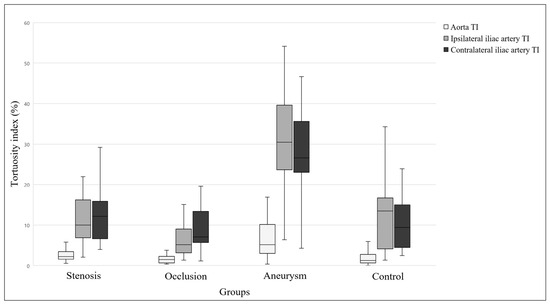Results of the tortuosity index comparison. The graph shows the median, interquartile range, minimum, and maximum of the data. TI—tortuosity index.