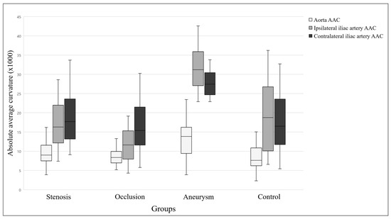 Results of the absolute average curvature comparison. The graph shows the median, interquartile range, minimum, and maximum of the data. AAC—absolute average curvature.
