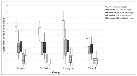 The median aortic bifurcation angle was 65.4° (IQR, 57.4–70°) in the stenosis group, 59.5° (IQR, 52.4–61.6°) in the occlusion group, 59.9° (IQR, 46.5–75.1°) in the aneurysm group, and 53.1° (IQR, 45.3–60.8°) in the control group. No significant differences in iliac take-off and planarity angles between the ipsilateral and the contralateral side were detected in any of the groups (Table 4).