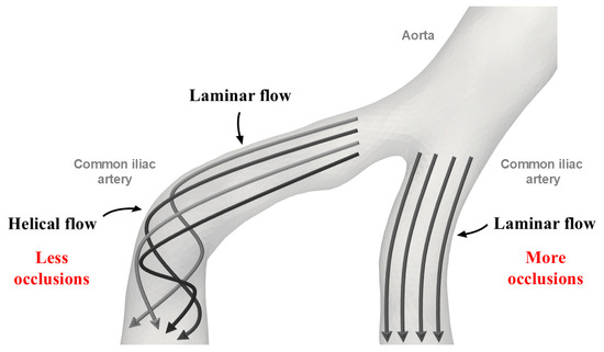 We found, in our study, that contralateral iliac artery elongation was greater than ipsilateral (with pathology) iliac artery elongation in patients with isolated CIA occlusion. This result seems surprising given the known proatherogenic effects of increased curvature and tortuosity which include altered wall shear stress. Therefore, we expected that the elongation of the ipsilateral iliac artery, but not the contralateral iliac artery, would be more pronounced in the occlusion group. A possible explanation for our observation could be arterial secondary flow. Arterial blood flow typically consists of primary (laminar) and secondary flow components (Figure 6). Centrifugal and torsional forces generate the secondary flow components in curves and branch points [30,31]. Helical secondary flow components have been detected in arterial bends [32], and several studies have shown that these helical flows can enhance blood transport, reduce blood cell adhesion, and prevent the accumulation of atherogenic low-density lipoproteins [33,34]. The atheroprotective and flow-stabilizing properties of helical flow have been documented in many segments of the human arterial system such as the coronary arteries, the carotid bifurcation, and the aorta [35,36,37]. However, further studies are needed to evaluate the flow characteristics of the aortoiliac region in the presence of steno-occlusive disease.