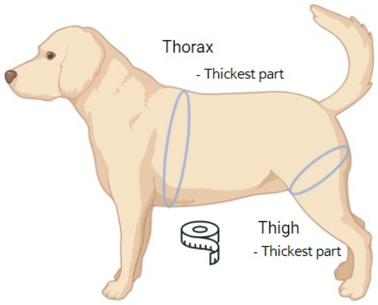The body condition score was first introduced in dairy cows to evaluate their productivity [1]. It is traditionally used in the form of a five-grade or nine-grade scale, and a higher grade reflects more body fat. A score of three points on the five-grade system or five points on the nine-grade system is suitable for the healthy maintenance of cows. The BCS is also applied to other animals, including small animals such as feline and canine species. The criteria of the BCS are visibility of the rib, lumber vertebrae, and pelvic bone and discernible waist in dogs, and an ideal state of body is four to five points on the nine-grade system [2,3]. As this is a somewhat subjective element, evaluation of the BCS can vary slightly depending on the person measuring it [4], and the scores are not subdivided in detail, so it is quite difficult to monitor subtle differences [5]. Failure in monitoring subtle differences using the BCS can lead to obesity [6], hyperlipidemia [7,8], and other endocrine diseases such as Cushing’s disease. Hyperlipidemia commonly results in diabetes, hypothyroidism, and Cushing’s syndrome in dogs [9] as well as humans [10,11]. To date, the correlation between hyperlipidemia and orthopedic diseases has not been clearly documented in dogs, and there are only a few studies on the effects of hyperlipidemia on knee tendons in rats [12,13]. However, the anatomy of dogs and rats is very different, so the results may not be applicable to dogs [14,15]. In contrast, there are many studies on the correlation between obesity, BCS, and orthopedic diseases, and numerous studies have attempted to develop monitoring indicators and prognostic evaluation biomarkers to assist in assessing the BCS [16,17,18,19]. In humans, abdominal fat is closely related to hypertension and the waist/hip ratio, which is positively correlated with cardiovascular disease in epidemiological research [20]. Additionally, high-density lipoprotein (HDL), which is known as ‘good cholesterol’ that cleans fat in vessel to lower the possibility of cardiovascular disease, is reported to be negatively correlated to truncal fat and waist/hip ratio [21]. Moreover, abdominal fat can increase insulin resistance, leading to a higher risk of diabetes mellitus [22]. Therefore, in order to manage abdominal fat effectively, various indicators such as waist/hip ratio and waist/chest ratio, along with Body Mass Index (BMI), have been developed [23]. Additionally, although BMI-related abdominal fat is commonly associated with diabetes mellitus, hypertension, and cardiovascular diseases, hind leg muscle circumference has been shown to be a better indicator than BMI in respiratory diseases such as Chronic Obstructive Pulmonary Disease (COPD) [24]. In contrast, there are few biomarkers or indicators other than the BCS for monitoring obesity and related diseases even though their importance is increasing in veterinary medicine [25,26,27]. Moreover, in veterinary medicine, there are breed differences even in the same species, so the same BCS does not always reflect the same body fat, especially in dogs [25]. For example, Schnauzers are genetically prone to hyperlipidemia because Very-Low-Density Lipoprotein (VLDL) and chylomicrons accumulate abnormally to a large degree in this breed compared to other breeds [28]. Thus, Schnauzers may be more susceptible than other breeds to hyperlipidemia-related diseases such as pancreatitis, and it has been demonstrated that it may be related to mutation of the SPINK1 gene [29]. Therefore, the author would like to introduce a new indicator, thorax/thigh ratio in dogs, which resembles the waist/hip ratio in humans. Comprehensive monitoring of body fat in a detailed but simple way is key to managing health successfully in veterinary medicine as well as in human medicine. The significance and originality of this study lies in its development of an indicator that can be used alongside the BCS and body weight to diagnose hyperlipidemia and related diseases.