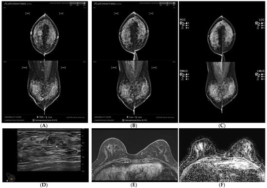 A 54-year-old woman diagnosed with breast cancer presenting as a mass with calcifications, exhibiting a surgically confirmed pathologic complete response (pCR) following neoadjuvant chemotherapy (NAC). (A,B) Mammography was analyzed using AI-CAD, identifying an area in the left central breast of a mass with calcifications in pre-NAC images (AI-CAD score 98% on the MLO view), and no mark was detected in post-NAC images. (C) Utilizing conventional CAD, identifying an area in the left central breast corresponding to the calcifications in post-NAC images. (D) Post-NAC ultrasound recorded a reduction in mass size from 26 mm. (E) Post-NAC maximal intensity projection (MIP) of contrast-enhanced MRI (CE-MRI) documented a mass reduction from 36 mm. (F) Post-NAC ADC map of DWI displayed regression of the mass.