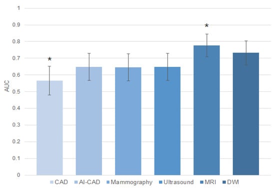 Area under the ROC curves for pCR prediction in post-NAC imaging modalities. * denotes a statistically significant difference.