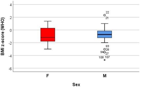 “Box and whiskers” chart representing the BMI z-score (WHO), according to the gender of the patients.