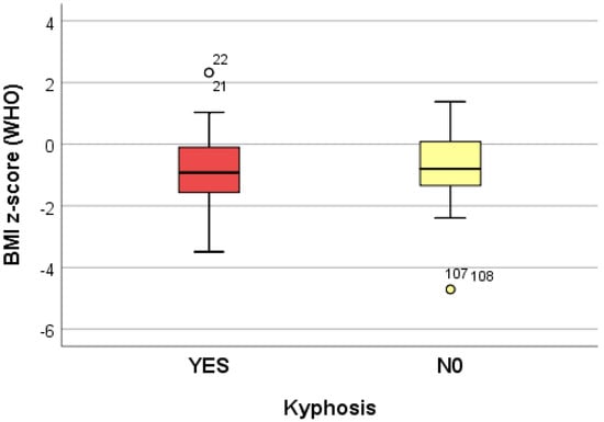 “Box and whiskers” chart representing the BMI z-score (WHO), according to the presence of kyphosis.