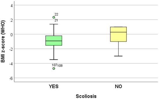 “Box and whiskers” chart representing the BMI z-score (WHO), according to the presence of scoliosis.