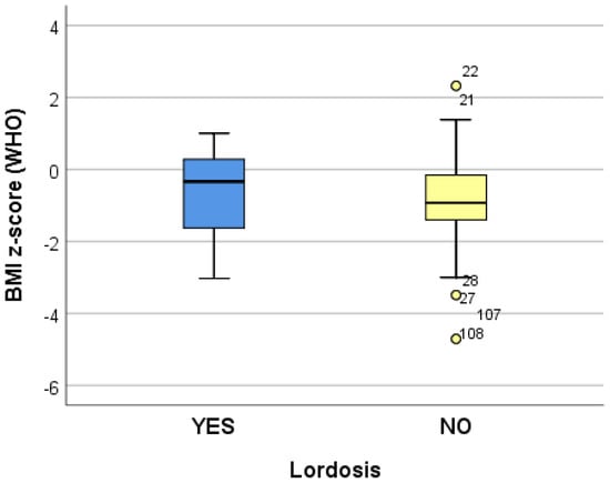 “Box and whiskers” chart representing the BMI z-score (WHO), according to the presence of lordosis.