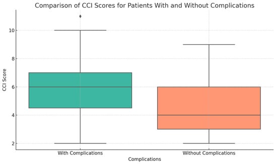 The investigation we conducted showed clear connections between the CCI and the occurrence of postoperative complications (Figure 1). The Mann–Whitney U test revealed a statistically significant difference in the CCI scores between patients with complications (mean: 5.92, SD: 2.31) and those without issues (mean: 4.43, SD: 1.87), with a p-value of 0.0078.