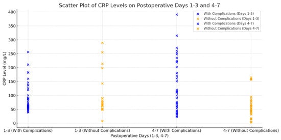 The use of CRP ratios, which assess CRP levels at different postoperative intervals, enhances the accuracy and precision of prognostic evaluations, providing a dynamic assessment of the patient’s inflammatory response [15,16].