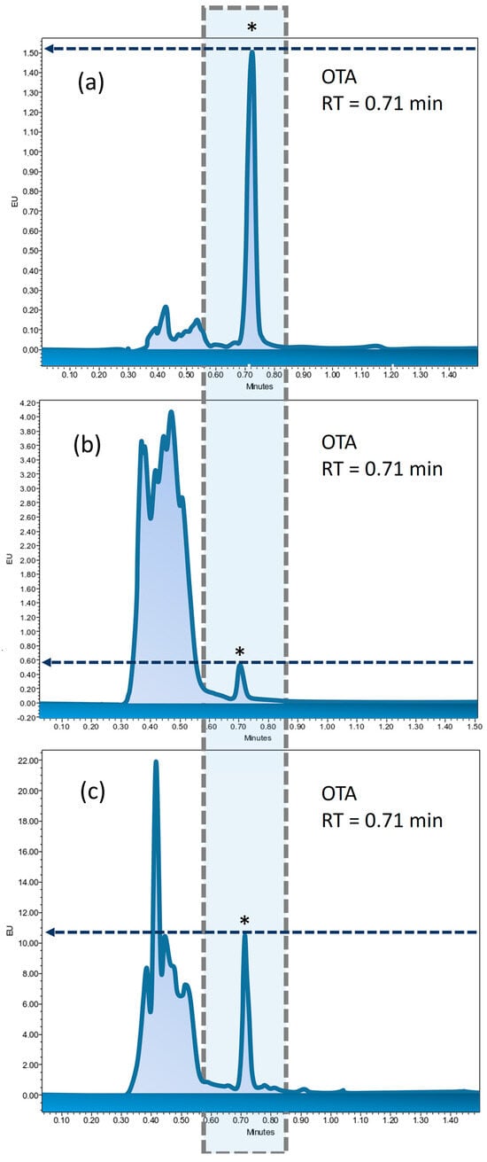 Typical UPLC-FLD chromatograms of OTA: (a) reference standard solution (3 ng/mL), (b) QC (maize), and (c) maize sample (M3). * represents the OTA peak.