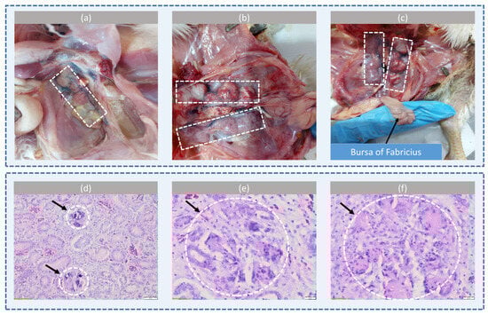 Gross and histopathological lesions from Ross 308 gout-affected commercial broiler chickens after exposure to feed with mycotoxins. (a) Swollen kidneys full of chalky deposit and the dilatation of ureters; the kidneys are marked by dashed white-line box. (b) The kidneys are enlarged, degenerate, and filled with urates, with bilateral multifocal petechiae; the kidneys are marked by the dashed white-line box. (c) The gross examination of the bursa of Fabricius reveals significant atrophy, with a notable reduction in size and weight, and pale discoloration; the kidneys are marked by the dashed white-line box. (d) Visceral gout, observed in the transverse cross-section of the chicken kidney. Bluish-purple urate deposits in the lumen of renal tubules forming urate cylinders (arrows), HE stain. (e) Gout tophi (indicated by a white dashed circle and arrow), with cellular spicules surrounded by macrophages and multinucleated giant cells, moderate interstitial lymphocytic and histiocytic nephritis, tubular degeneration, and necrosis in the chicken kidney, HE stain; (f) Gout tophi (indicated by a white dashed circle and arrow), with interstitial fibrosis and urate deposits in the chicken kidney, HE stain.