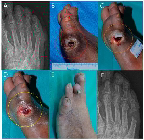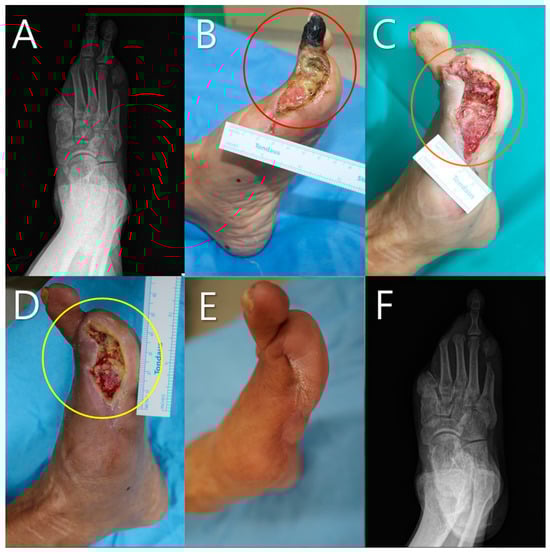 A 65-year-old male patient with a history of diabetes and peripheral arterial disease. (A) Initial X-ray showing the extent of bone involvement. (B) Clinical photograph prior to debridement, highlighting the necrotic tissue and bone exposure (red circle). (C) Post-debridement image showing the wound bed before micronized acellular dermal matrices (mADMs) application (orange circle). (D) Wound after 3 weeks following a total of five mADM applications, demonstrating significant granulation and healing progress (yellow circle). (E) Wound at the 8-week follow-up, showing re-epithelialization. (F) Final X-ray showing successful healing despite the presence of a bone defect, indicating effective re-epithelialization and wound closure.