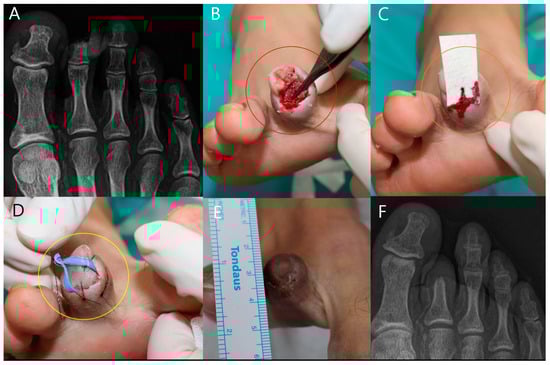 A 62-year-old female patient with a history of uncontrolled diabetes mellitus. (A) Initial X-ray showing bone resorption in the distal phalanx. (B) Intraoperative image after debridement, revealing significant bone exposure (red circle). (C) Single application of micronized acellular dermal matrices (mADMs) applied to the exposed bone (orange circle). (D) Wound closure achieved after mADM application, secured with sutures (yellow circle). (E) Six-week postoperative image showing substantial wound healing and epithelialization. (F) Final X-ray displaying successful bone regeneration and no evidence of osteomyelitis.