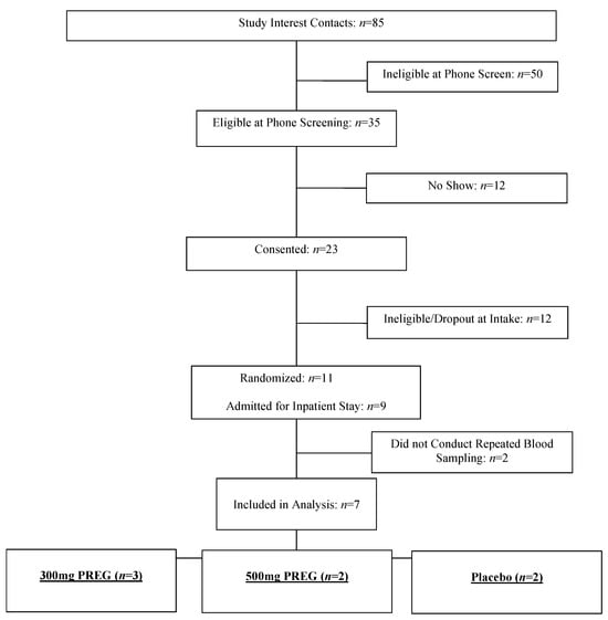 All graphing and data analyses were conducted using R v4.4.1, employing the ggplot2 v3.5.1, and dplyrv1.1.4 packages [21,22]. One-way ANOVA and chi-square tests were utilized to assess differences in demographic and cocaine use characteristics among the three participant groups. Changes in PREG concentration levels over the 24 h cycle were analyzed using linear mixed-effects models (lme4 v1.1.35.5 and emmeans v1.10.4 packages [23,24]). The models included fixed effects for the treatment groups (placebo, 300 mg PREG, and 500 mg PREG) and time points, with a random intercept for each participant. Satterthwaite’s approximation was used for the denominator degrees of freedom. The interaction term between time points and treatment was initially included but dropped due to non-significance. Pearson correlations were conducted among time points 0 to 8 h after the first dose to assess the stability of pregnenolone levels. For one subject missing the 0 h value from Day 1, the 0 h value from Day 2 was used instead, as both are 8 a.m. measurements and reflect baseline time points prior to taking the daily morning study drug. Significance for this pilot data was set at p < 0.05.