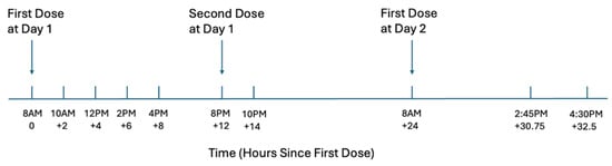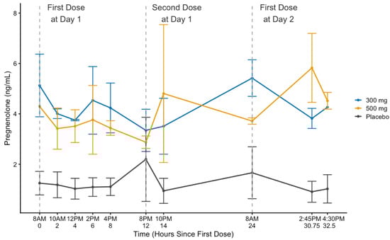 Repeated blood samples were collected at multiple time points to measure pregnenolone levels. On day 1 of this serial sampling phase, blood draws were conducted at 8 a.m., 10 a.m., 12 p.m., 2 p.m., 4 p.m., 8 p.m., and 10 p.m. (0, 2, 4, 6, 8, 12, and 14 h post-first dose). On day 2, additional blood samples were collected at 8 a.m., 2:45 p.m., and 4:30 p.m. (24, 30.75, and 32.5 h post-first dose). See Figure 2 for an illustration of the blood collection timeline.
