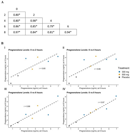 (A) Pearson correlation matrix of significance for levels of pregnenolone and time points. Asterisk (*) indicates positive significant correlation (p < 0.05). (B) Correlation of plasma levels of pregnenolone at time of dose one administration with pregnenolone levels at 2 h (B(I)), 4 h (B(II)), 6 h (B(III)), and 8 h (B(IV)) after pregnenolone administration.