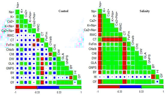 Pearson’s correlation coefficients among different ionic, physiological, growth, yield, and yield component traits of wheat genotypes grown under control and salinity stress conditions. Na+, K+, and Ca2+: contents of sodium, potassium, and calcium (mmol kg−1 DW), respectively; RWC: relative water content (%); CT: canopy temperature (°C); Fv/Fm: maximum quantum PSII photochemical efficiency; Chla/Chlb: chlorophyll a/b ratio; Chlt: total chlorophyll content (mg g−1 FW); PDW: plant dry weight (g plant−1); GLA: green leaf area (cm2 plant−1); GNPS: grain number per spike; BY: biological yield (ton m2); GY: grain yield (ton m2); and HI: harvest index (%).