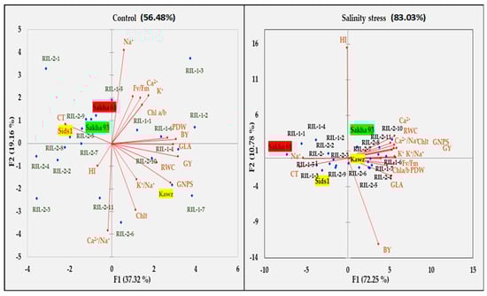 Based on the PCA biplot, the various varieties/RILs were spread out in all four quadrants of the biplot in control conditions, whereas most of them were grouped together in only two quadrants under salinity stress conditions (Figure 2). The salt-tolerant Sakha 93 and salt-sensitive Sakha 61 were located in the low PC1 and high PC2 regions of the biplot in control conditions. However, under salinity stress conditions, Sakha 93 shifted to high PC1 and PC2, while Sakha 61 moved to low PC1 and high PC2 (Figure 2). Importantly, the PCA biplot clearly separated the traits into two distinct groups under salinity stress conditions. The first group encompassed almost all traits, while the second group comprised Na+ content, CT, BY, and HI. The traits in the first group displayed significant positive correlations with each other, whereas the traits in the second group demonstrated marked negative correlations, both within the group and with the traits in the first group. Salt-tolerant Sakha 93 and Kawz, along with two RILs from the RIL1-group and seven RILs from the RIL2-group, showed close associations with traits in the first group, while the salt-sensitive Sakha 61, Sids 1, five RILs from the RIL1-group, and three RILs from the RIL2-group were closely associated with traits in the second group (Figure 2).