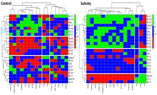 Two-way clustering heatmaps were utilized to classify the varieties/RILs into different groups based on all traits (Figure 3). The heatmap divided genotypes into three groups in both conditions. It effectively distinguished the salt-sensitive Sakha 61 from the salt-tolerant Sakha 93 under salinity stress conditions, while grouping both genotypes together under control conditions. The group containing the two genotypes (Sakha 93 and Sakha 61) under control conditions did not show the highest values for K+ and Ca2+ contents, RWC, Chlt, growth, and yield traits. Rather, the values of these traits for this group were intermediate between the values of the genotypes in the first and second groups. Additionally, the group with the two genotypes showed higher values for K+/Na+ and Ca2+/Na+ ratios, CT, and HI (Table 6). However, under salinity stress conditions, the group with Sakha 93 exhibited higher values for all traits except Na+ content, CT, and HI, compared to the group with Sakha 61. The group with Sakha 93 showed a 36.9% decrease in Na+ content, a 10.0% decrease in CT, and a 16.7% decrease in HI compared to the group with Sakha 61. Additionally, the group with Sakha 93 displayed a 6.3–51.4% increase in other ionic, physiological, growth, and yield traits compared to the group with Sakha 61 (Table 6).