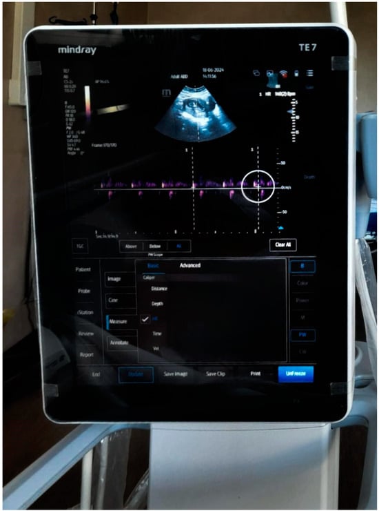 The patient was transferred postoperatively to the intensive care unit where she was monitored for 24 h after the intervention. Patient monitoring consisted of EKG, peripheral oxygen saturation, diuresis, and a non-invasive measure of systolic and diastolic blood pressures. The medication consisted of hydration with Ringer’s serum and continuous analgesia on the epidural catheter with ropivacaine 0.2% at a rate of 6–10 mL/h with changes made depending on symptoms. The surgical intervention was uneventful. There were no gallstones or gallbladder spillage in the peritoneal cavity. The gallbladder was intactly removed in an EndoBag from the peritoneal cavity. This fact imposed no drainage of the peritoneal cavity. The gallbladder was sent to the pathologist, but the bile had no bacteriological examination (no standard procedure in our hospital). Additional analgesia was achieved with one gram of paracetamol every eight hours. The antibiotic therapy started preoperatively with two grams of ceftriaxone and was continued both intraoperatively and postoperatively. Antithrombotic prophylaxis was performed with enoxaparin and stress ulcer prophylaxis with pantoprazole. Doppler ultrasound of the fetal heartbeat was performed immediately postoperatively and when the patient was discharged from the intensive care unit. The examination revealed no changes compared to the preoperative examination (Figure 1). The patient was discharged from the hospital 24 h after surgery. She was monitored for 24 h in the intensive care unit and after the surgical and obstetrical evaluation, she was discharged from hospital.